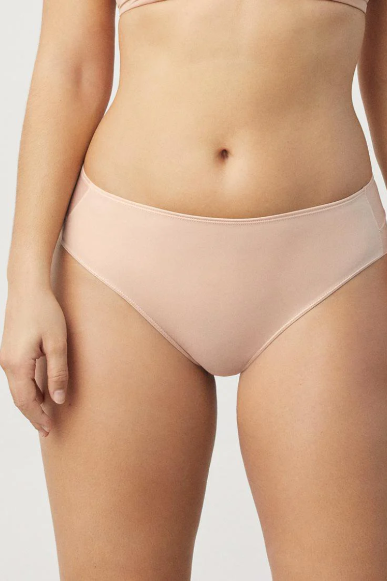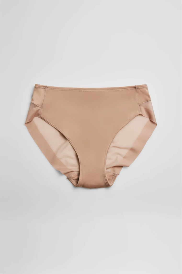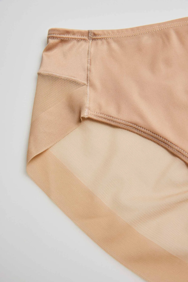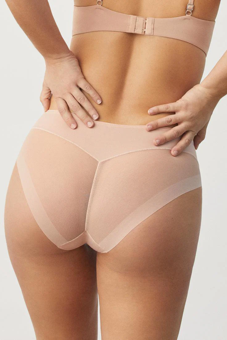 Figi o średniej wysokości, stworzone z myślą o komforcie i dyskrecji pod ubraniem. Przód uszyto z gładkiej mikrofibry, natomiast tył z elastycznej, delikatnej siateczki, która zapewnia lekkość i efekt niewidocznego wykończenia.