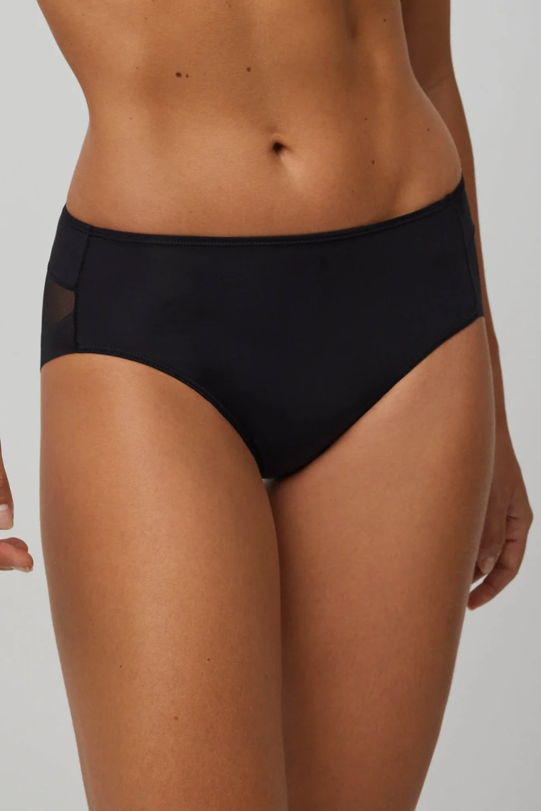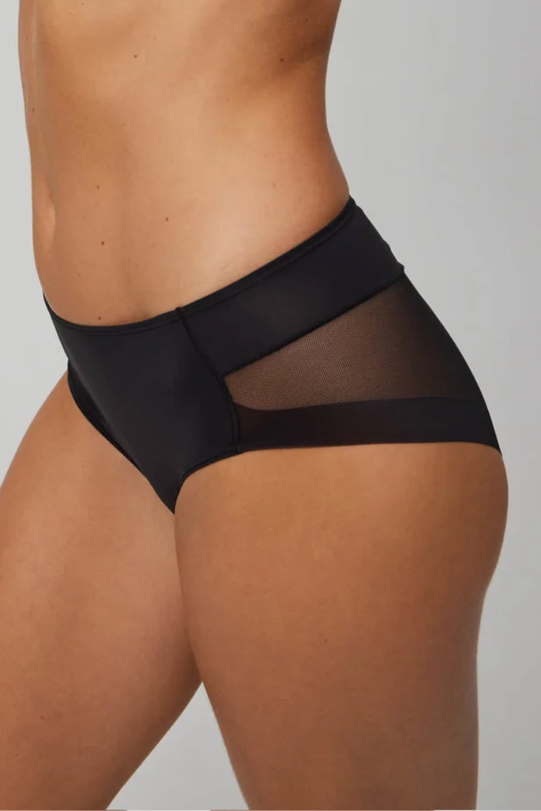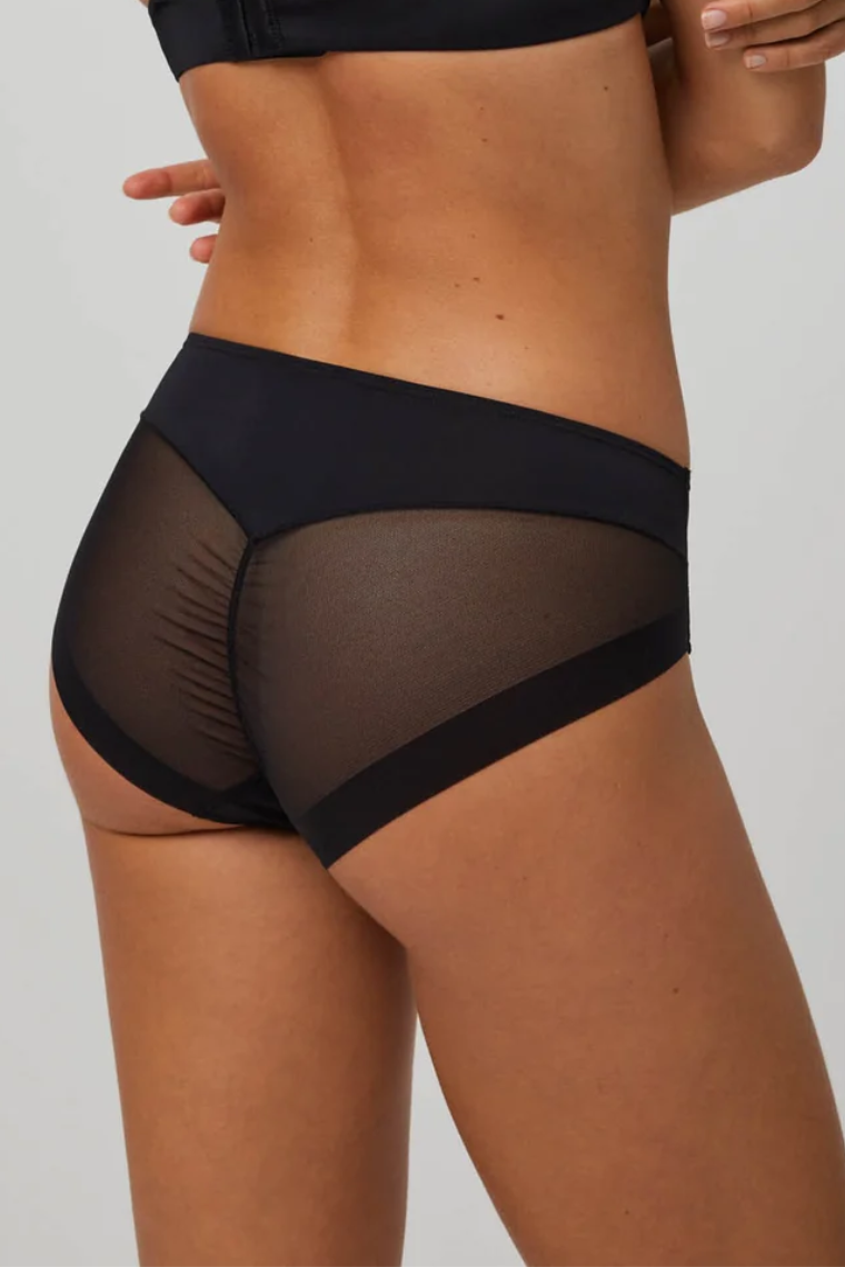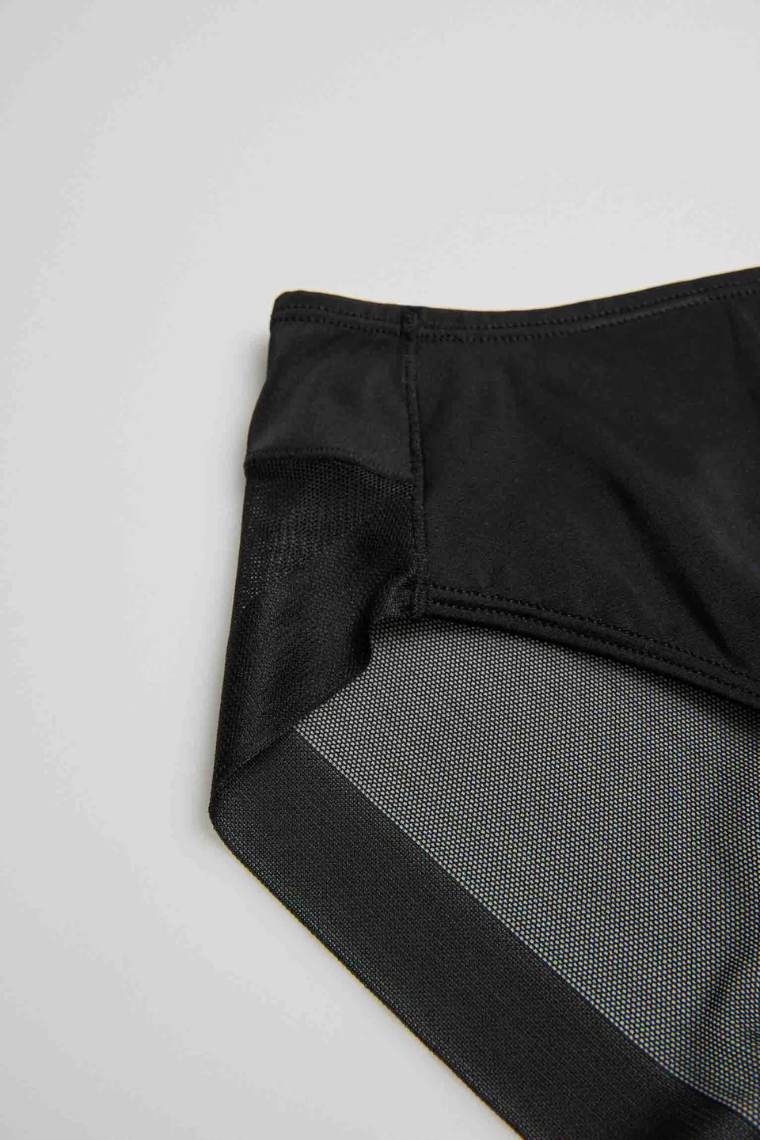 Czarne figi damskie bezszwowe o wysokości midi łączą wygodę tradycyjnych majtek z dyskrecją stringów. Przód wykonany z gładkiej mikrofibry, tył z elastycznej siateczki zapewnia niewidoczność pod ubraniem. Elastyczne, bezszwowe wykończenia gwarantują pełen komfort noszenia zarówno na co dzień, jak i przy bardziej wymagających kreacjach. Bawełniana wkładka w kroku zwiększa higienę i komfort.