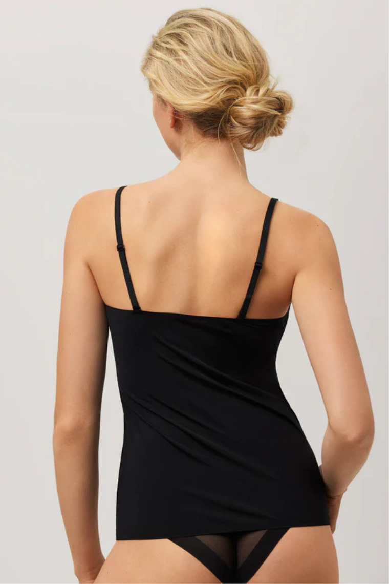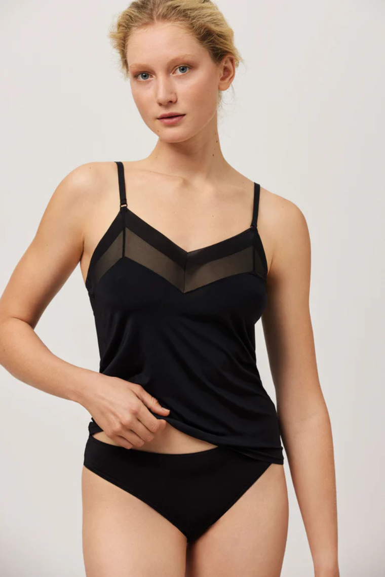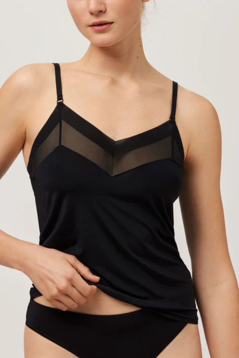 Przyciąga uwagę transparentną siateczką w okolicy dekoltu, która nadaje całości lekkości i subtelnej elegancji. Model posiada wąskie regulowane ramiączka z możliwością skrzyżowania na plecach.