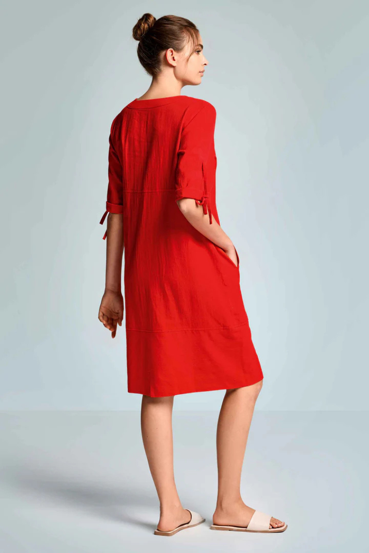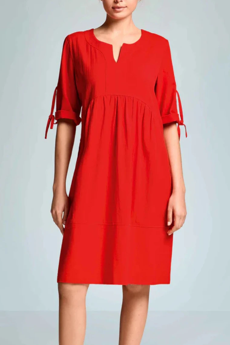 Model w intensywnym czerwonym kolorze przyciąga uwagę i dodaje stylizacji wyrazistości. Sukienka posiada luźny, wygodny krój, który nie krępuje ruchów i gwarantuje swobodę przez cały dzień.