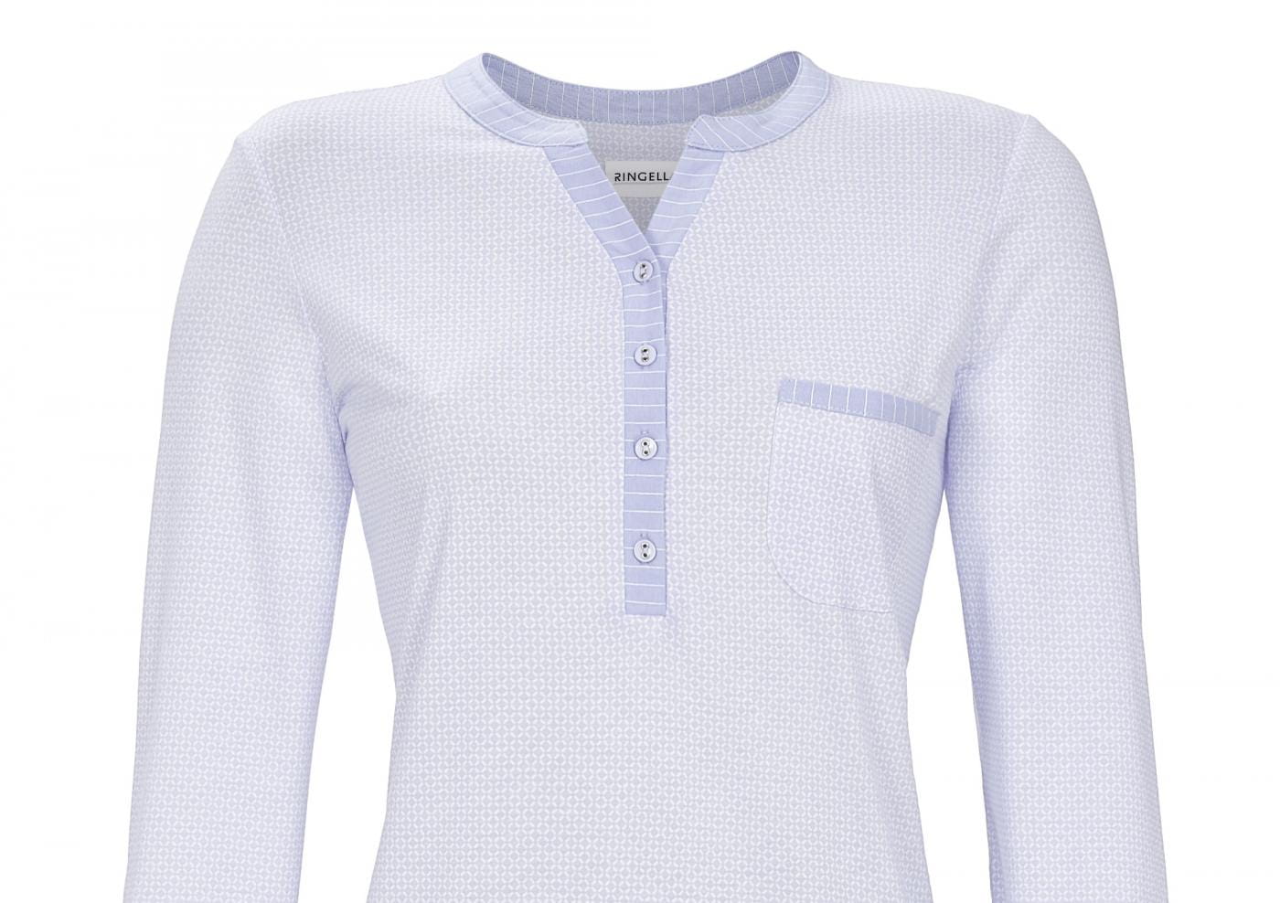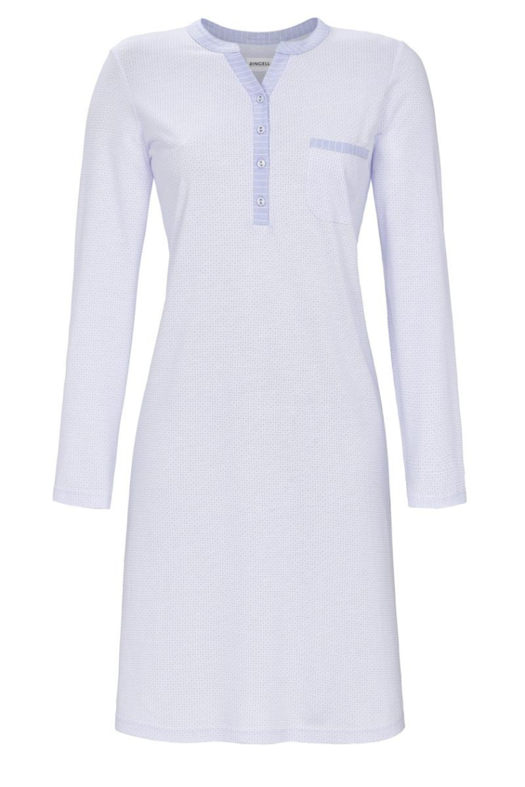 Koszula nocna w kolorze jasnoniebieskim z długim rękawem i stójką, ozdobiona delikatnym białym printem.