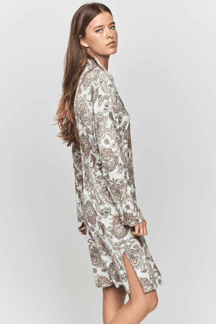 Koszula utrzymana jest w jasnej tonacji, ozdobiona efektownym paisley w pastelowych odcieniach, co nadaje całości wyjątkowej, stylowej oprawy. Długość przed kolano sprawia, że jest praktyczna i uniwersalna – doskonała na noc, ale też na leniwe poranki.