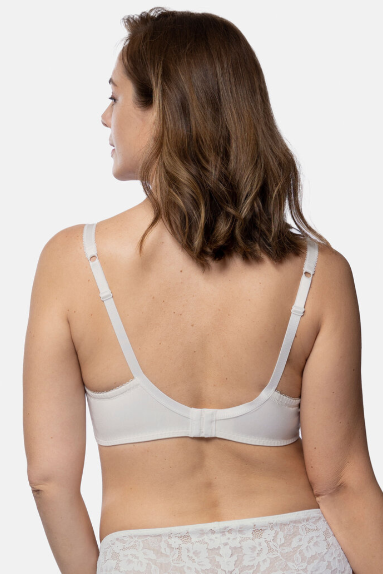 Elegancki miękki biustonosz na fiszbinie w kolorze kremowym z linii Eco, wykonany z mikrofibry z recyklingu i kwiatowej koronki. Materiały pochodzące z surowców wtórnych pozwalają na zmniejszenie zużycia wody i energii, a jednocześnie zapewniają aksamitną gładkość i komfort noszenia.