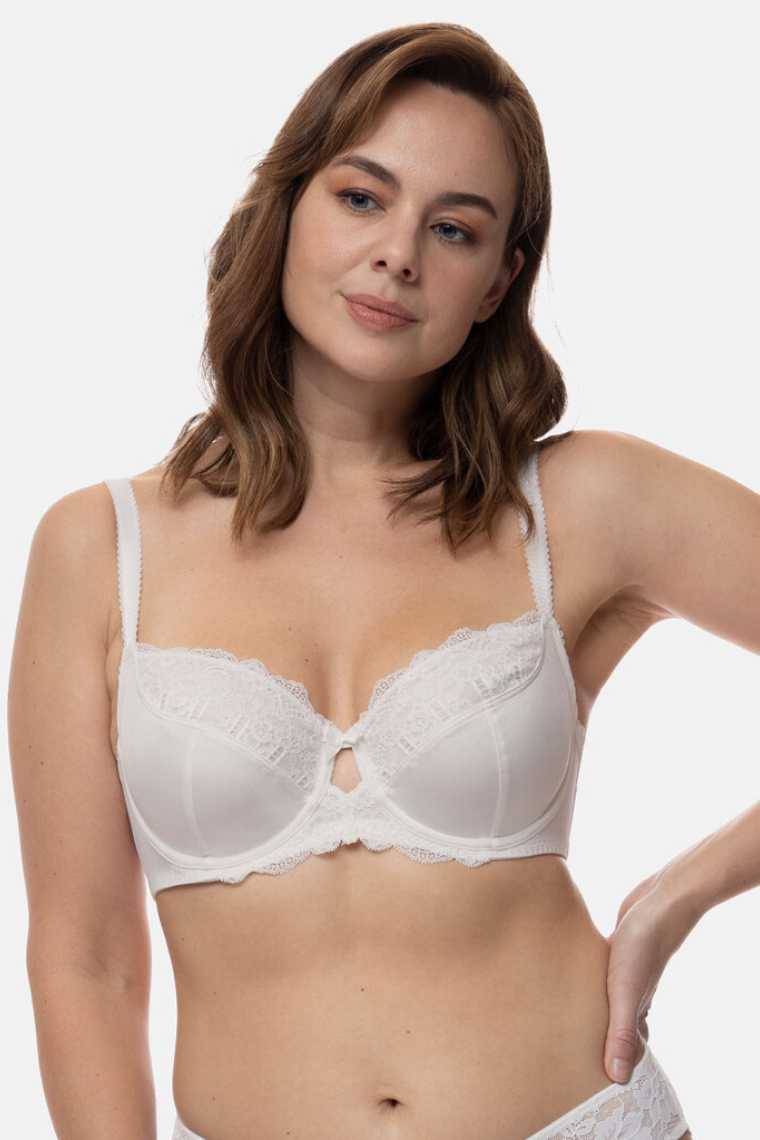 Biustonosz posiada trójdzielne miseczki z górną częścią z koronki, podszyte wzmacniającą siateczką, która stabilizuje biust i subtelnie ukrywa brodawkę. Wewnątrz znajduje się dodatkowy panel boczny, zapewniający odpowiednie zebranie piersi. Model jest idealny dla kobiet o średnim i większym biuście. Biustonosz wyposażony jest w boczne fiszbiny, regulowane ramiączka oraz pas obwodu z podszyciem. Drobny detal w postaci „oczka” na mostku nadaje całości lekkiego, eleganckiego wyglądu.