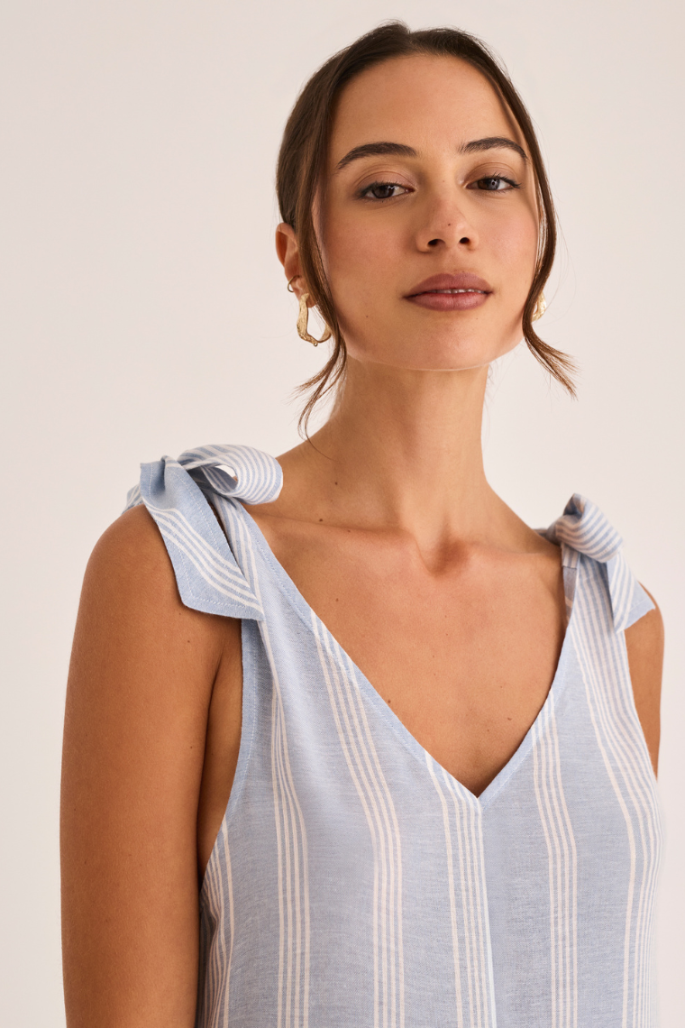 Drobne, białe, pionowe paski optycznie wydłużają sylwetkę i przywodzą na myśl letni, wręcz plażowy klimat.