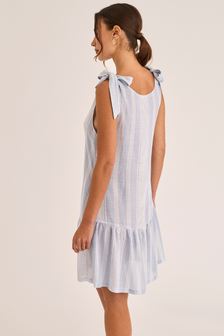 Sukienka ma luźny fason, który nie ogranicza ruchów. Posiada dekolt w serek oraz wiązane, nieco szersze ramiączka, umożliwiające delikatne dopasowanie. Dodatkowym atutem są praktyczne kieszenie boczne.