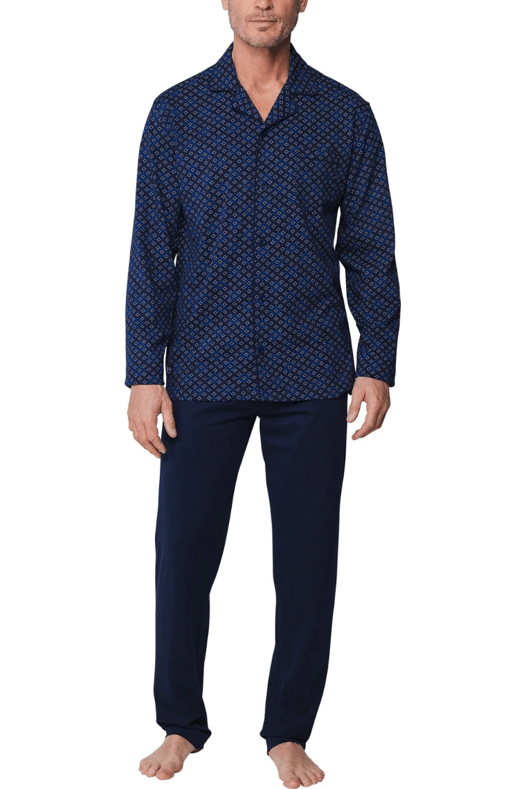 Bluzka z długim rękawem zapinana jest na guziki na całej długości, co ułatwia zakładanie i zdejmowanie. Stylowym detalem jest granatowa lamówka oraz kieszeń na piersi, które dodają klasycznego charakteru. Góra piżamy ozdobiona jest subtelnym graficznym nadrukiem na całej powierzchni.
