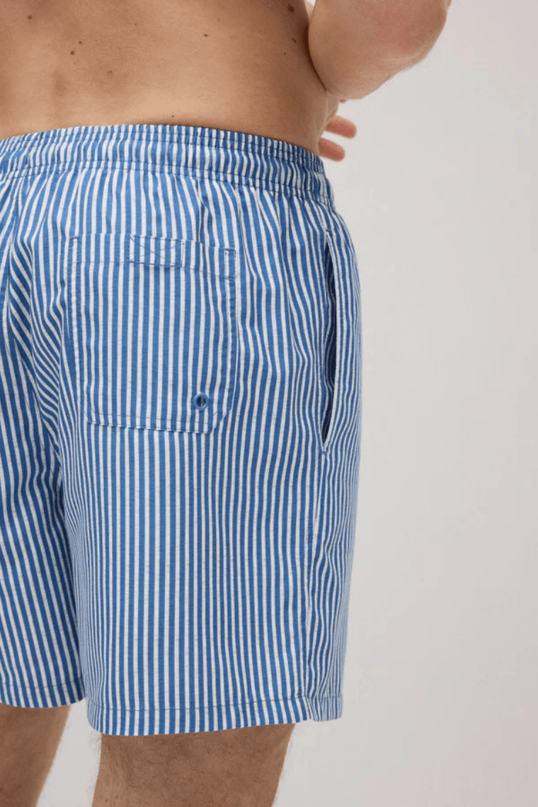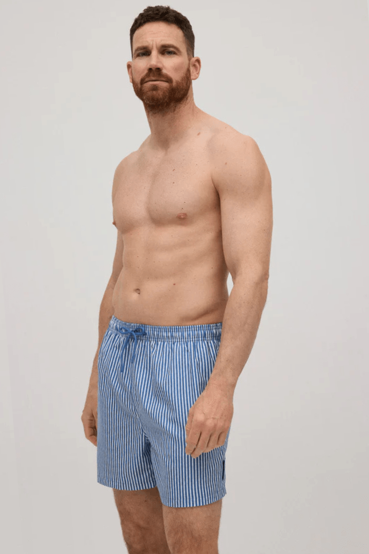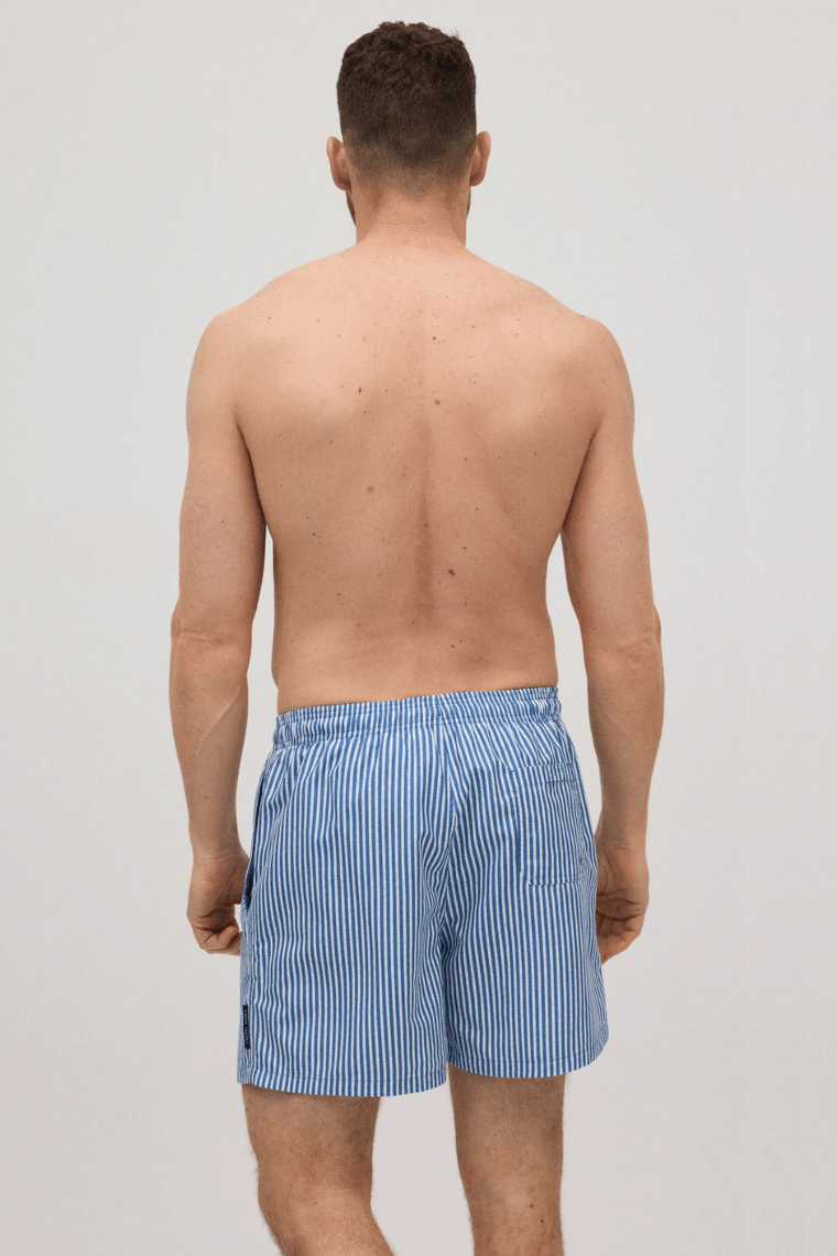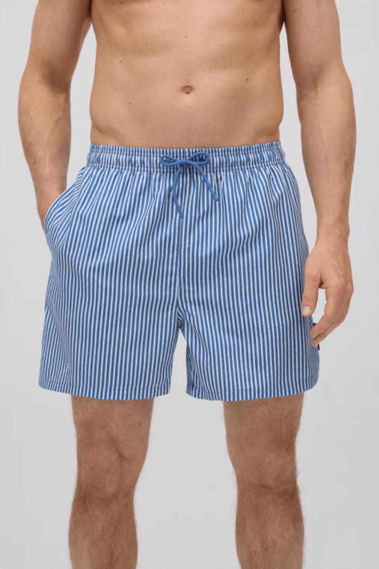 Stylowe męskie kąpielówki typu szorty z nadrukiem w pionowe biało-niebieskie paski. Wykonane z lekkiego, szybkoschnącego materiału, zapewniającego komfort podczas pływania i plażowania.