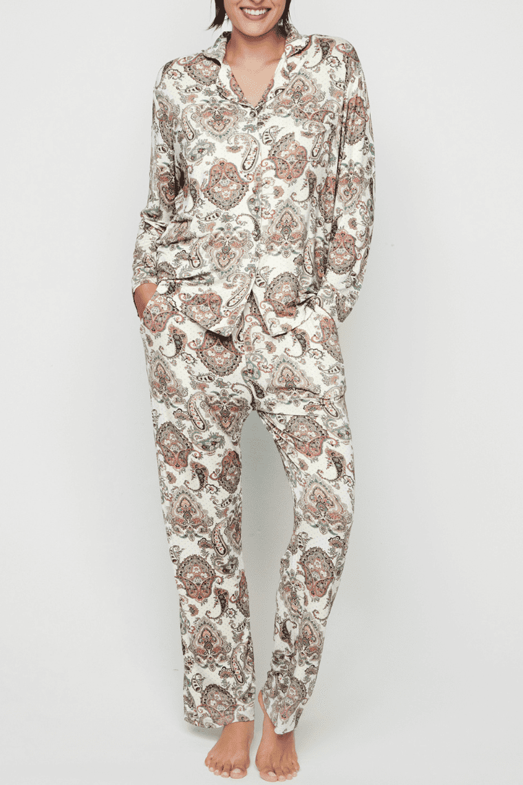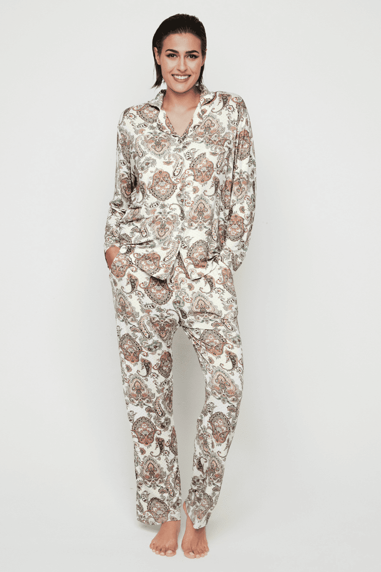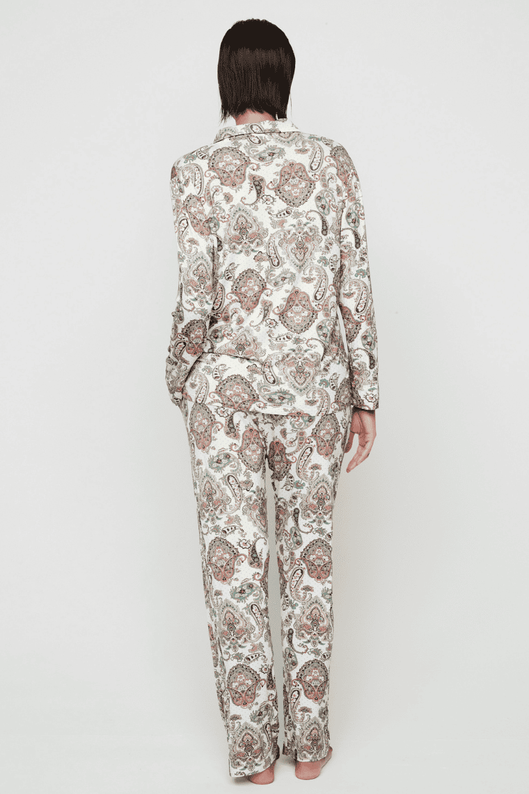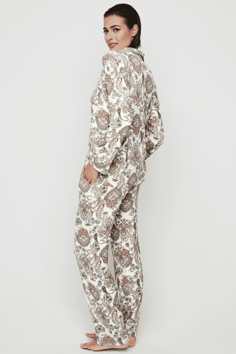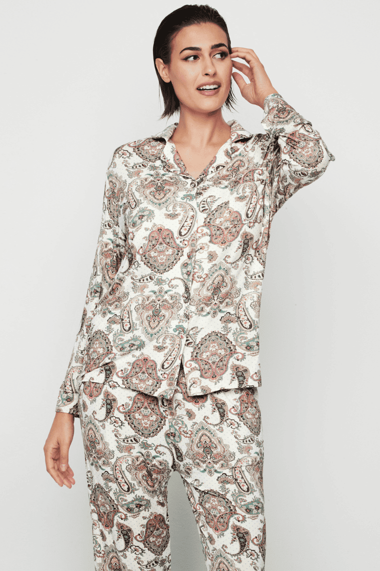 Całość utrzymana w jasnej tonacji, ozdobiona efektownym wzorem paisley w pastelowych odcieniach, który nadaje kompletowi wyjątkowego, kobiecego charakteru.