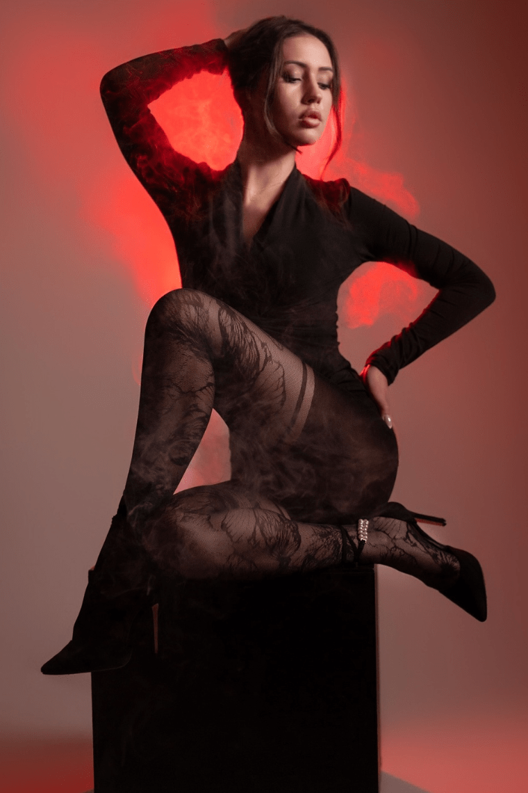 Rajstopy wzorzyste w kolorze czarnym. Grubość 20 den. Ozdobione efektownym kwiatowym wzorem.