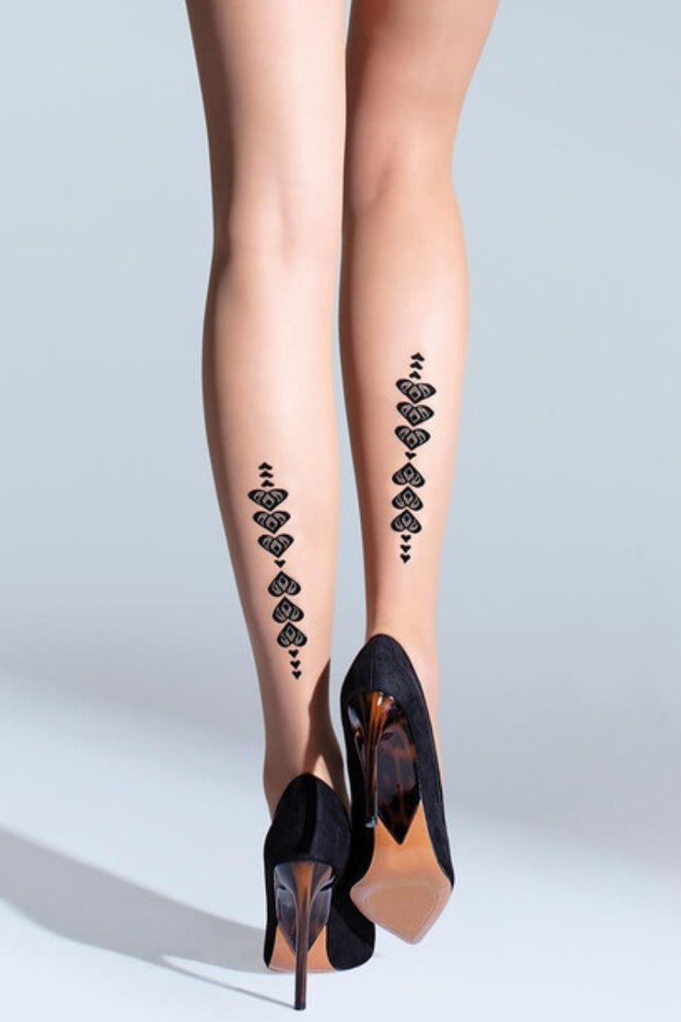 Transparentne rajstopy w kolorze naturalnym z czarnym wzorem.