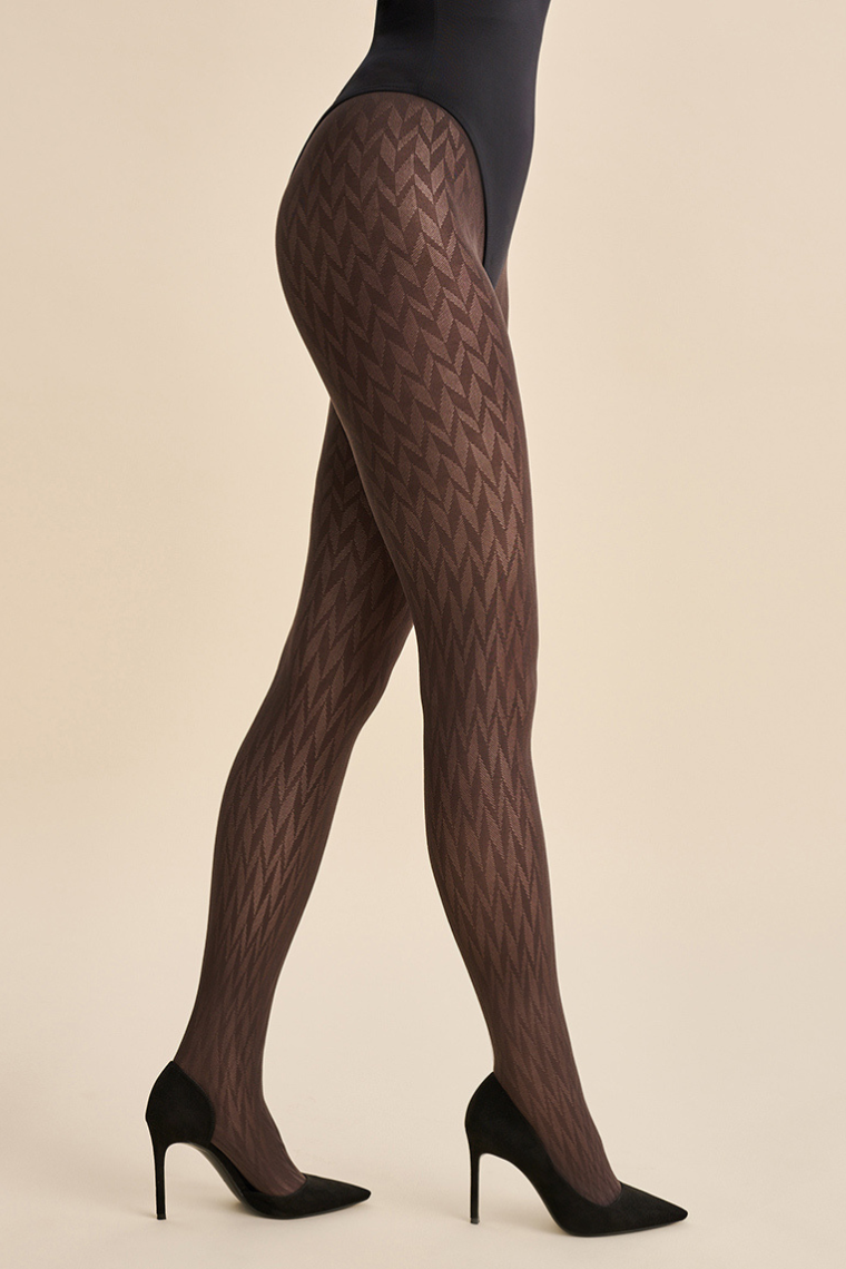 Wyrazisty geometryczny wzór przypominający jodełkę optycznie wyszczupli nogi, a wyjątkowy ciemnobrązowy kolor nada całej stylizacji niezwykłego charakteru!