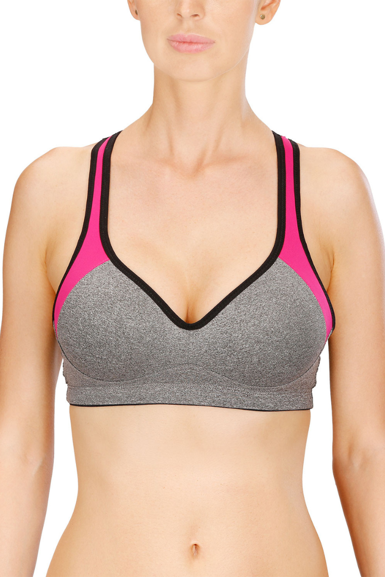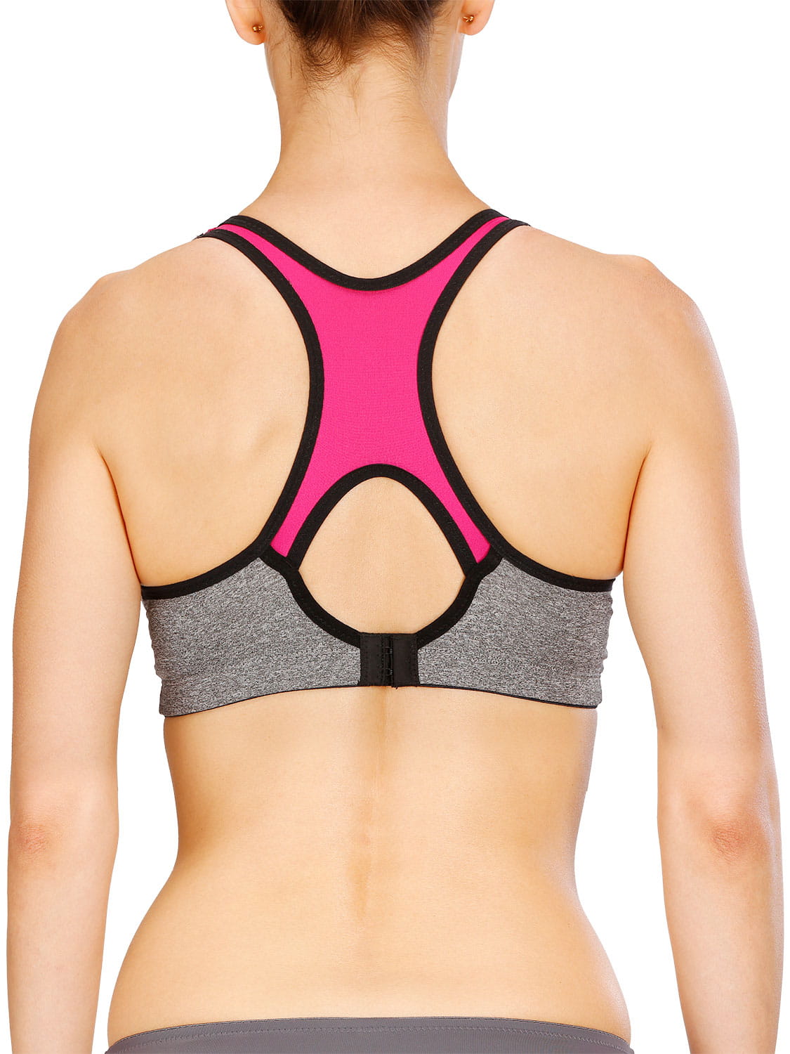 Biustonosz wykonany z elastycznej dzianiny o różnych fakturach, w kolorze szarego melanżu z różowymi wstawkami.