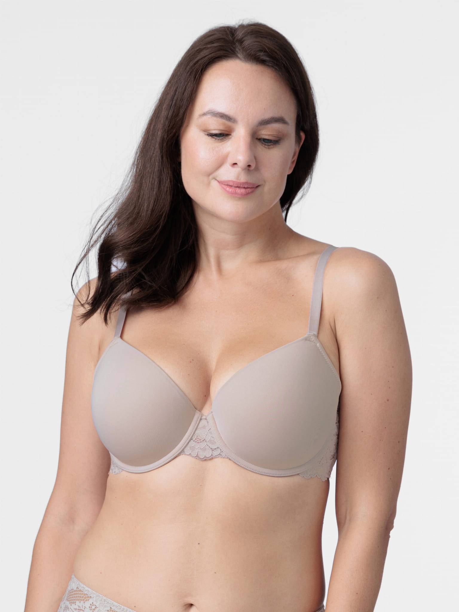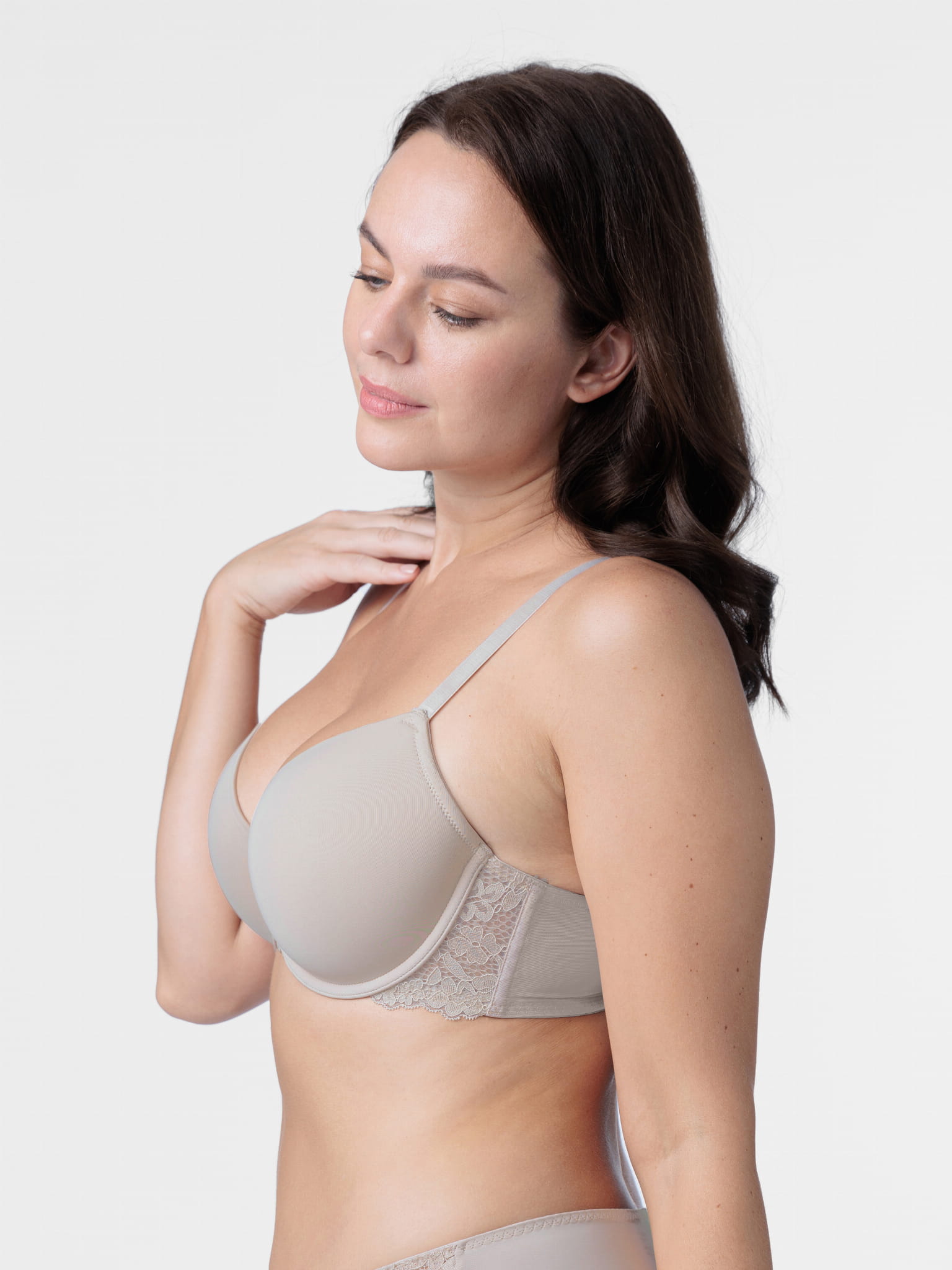 Biustonosz z usztywnionymi miseczkami na fiszbinach. Model typu "T-shirt bra", pozbawiony przeszyć na misce. Całkowicie gładka miska w kolorze beżowym sprawia, że stanik będzie doskonałą bazą pod każdą stylizację.
