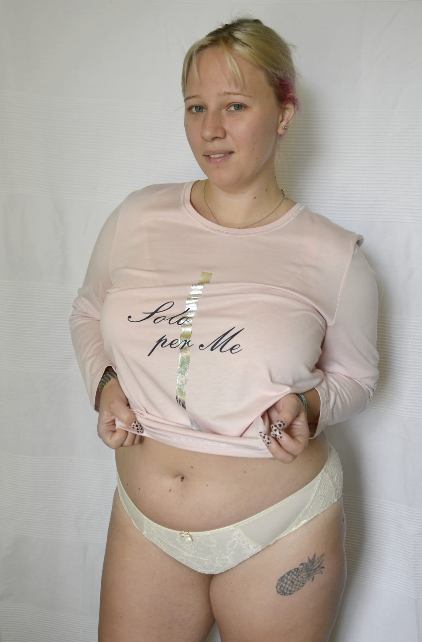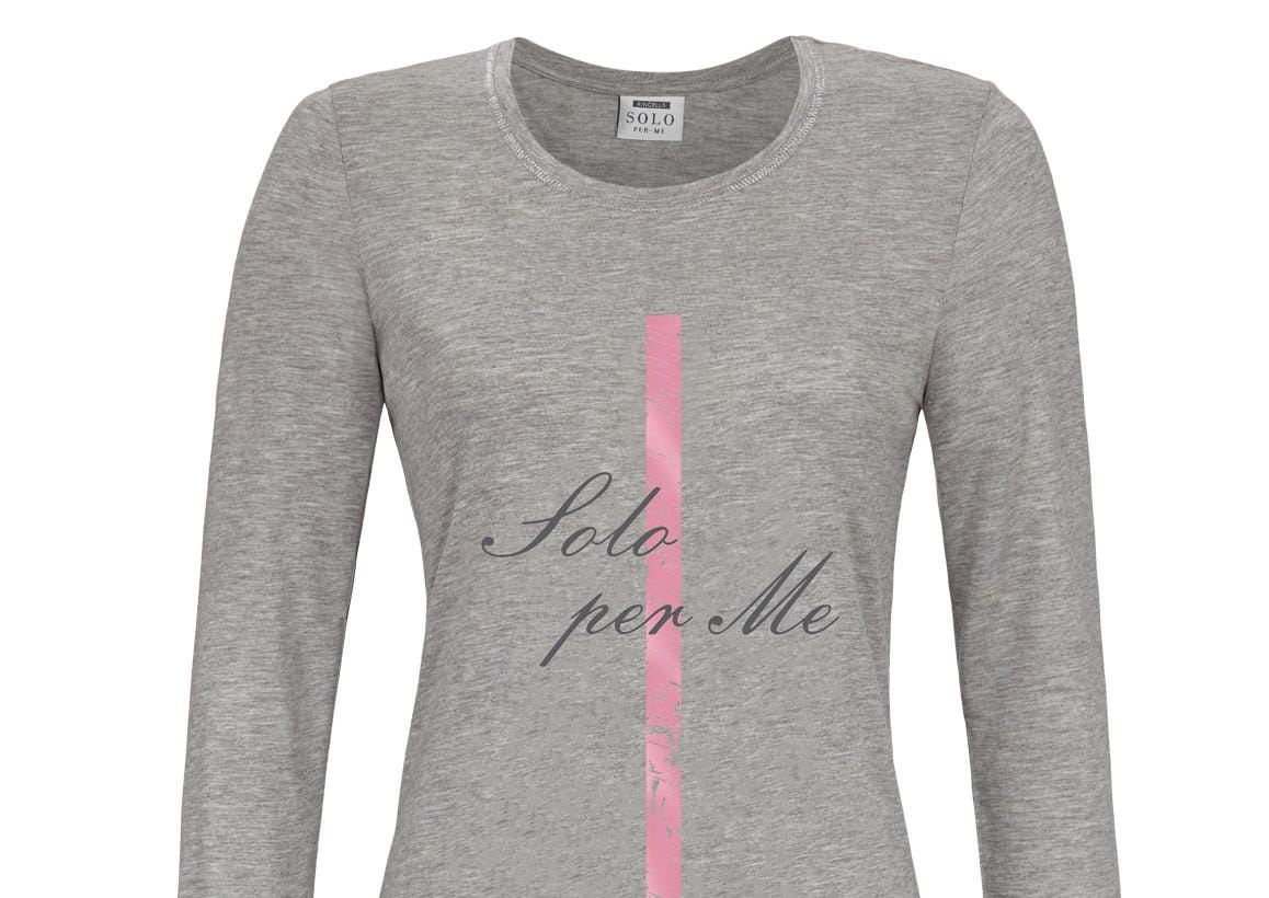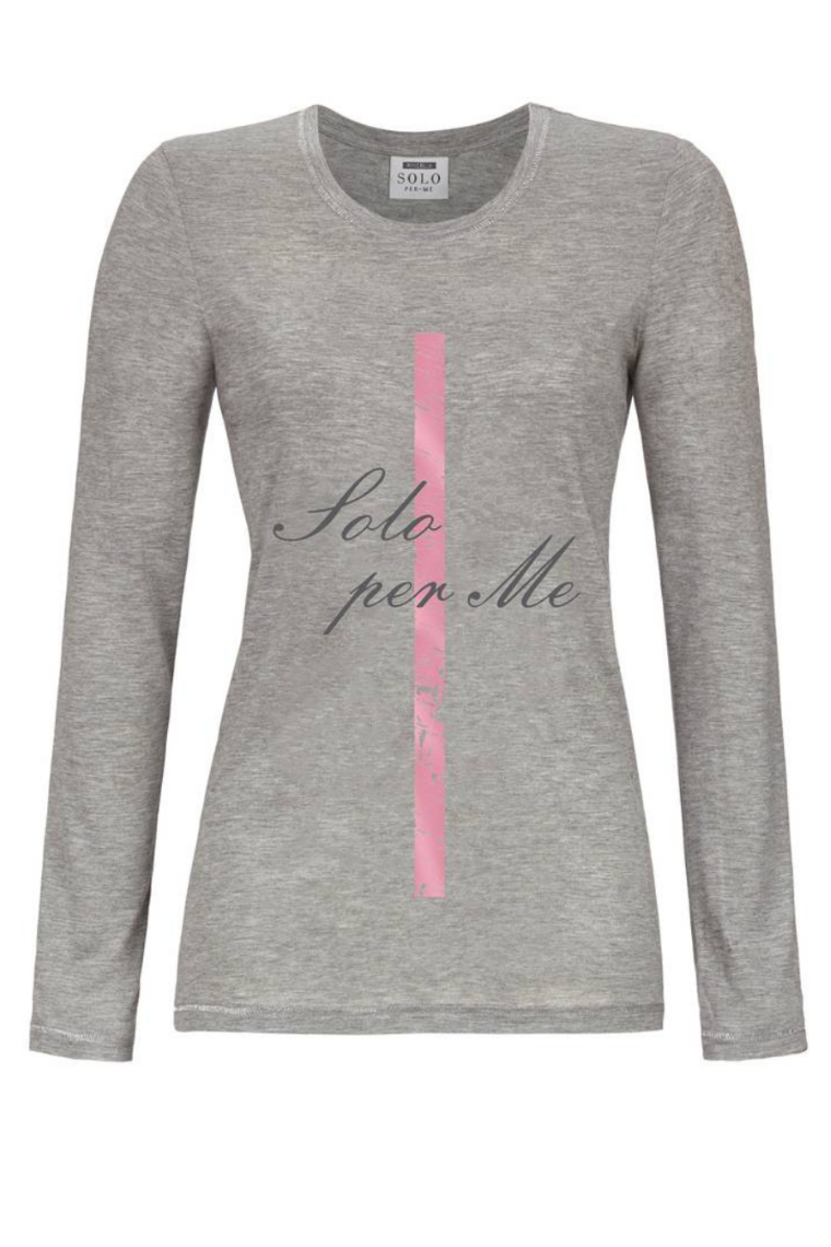 Posiada okrągły płytki dekolt. Piękne ozdobne szwy srebrnej metalicznej przędzy na dekolcie, rękawach i na dole przyciągają wzrok. Na przodzie bluzki nadrukowany motyw SOLO PER ME, ozdobiony różowym lub srebrnym błyszczącym paskiem w zależności od koloru bluzki.