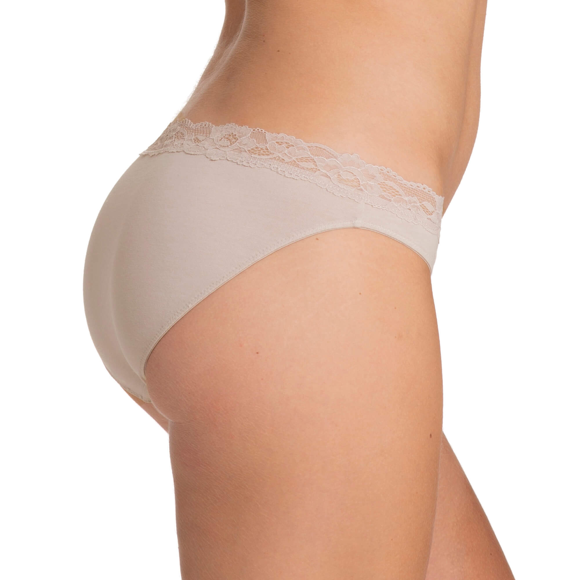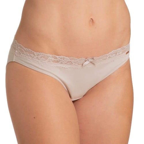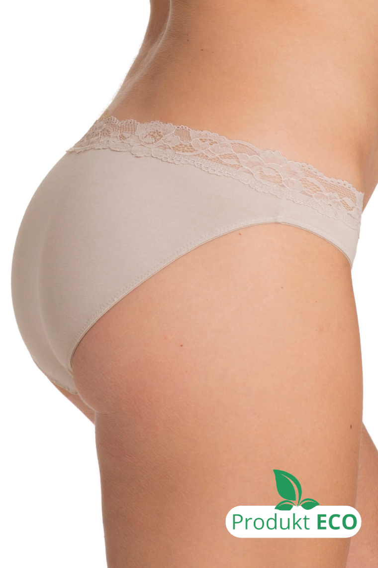 Bawełniane figi z koronką w kolorze beżowym (cieliste). Model pochodzi z linii Eko, gdzie produkty wykonane są z surowców wtórnych przy zmniejszonym zużyciu wody i energii.