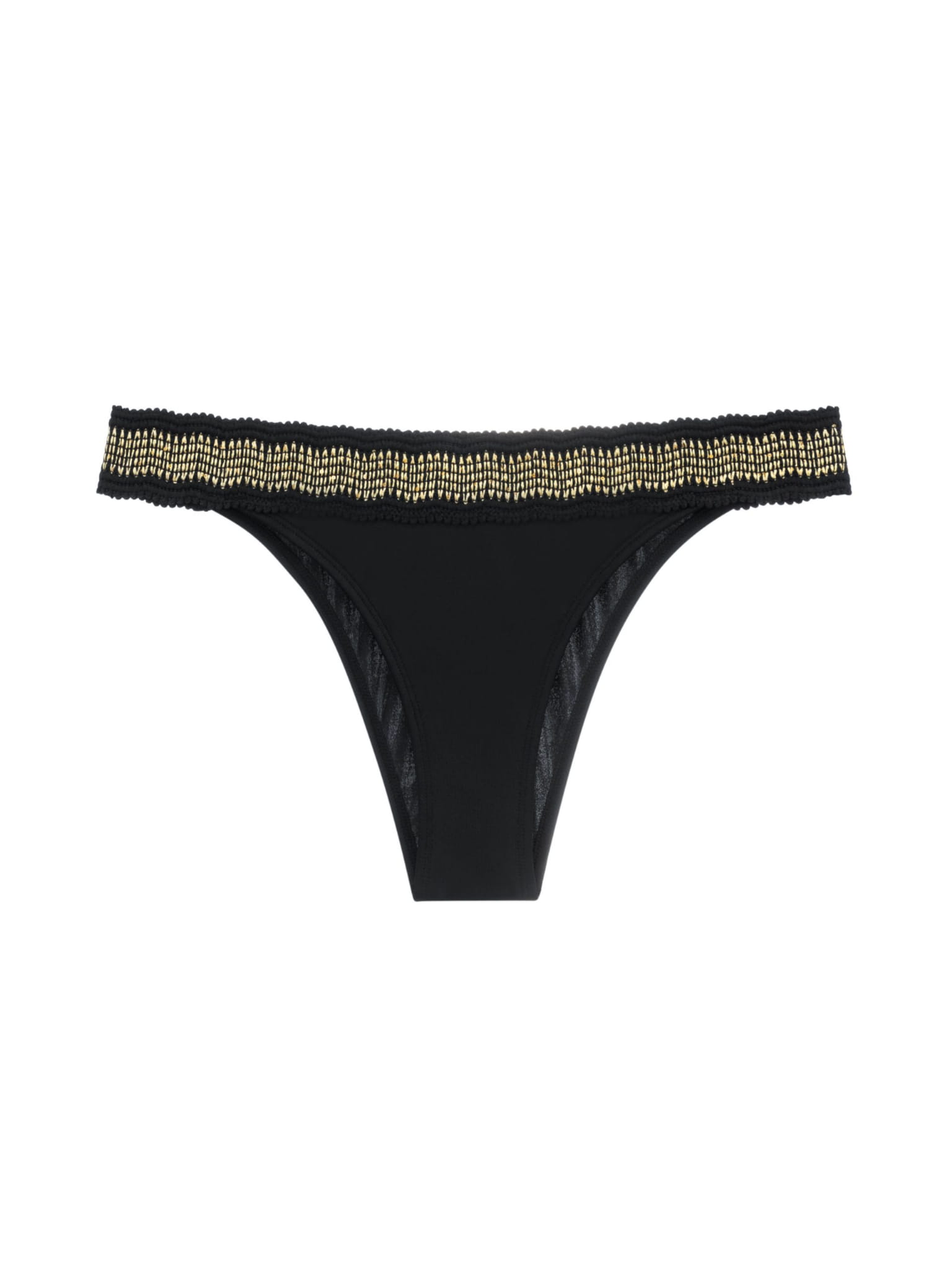 Górna linia fig wykończona jest żakardową gumką obszytą złotą nitką, z wplecionymi małymi cekinami, które subtelnie połyskują w słońcu. Model doskonale komponuje się z biustonoszem kąpielowym z serii JACQ, tworząc kompletny zestaw.