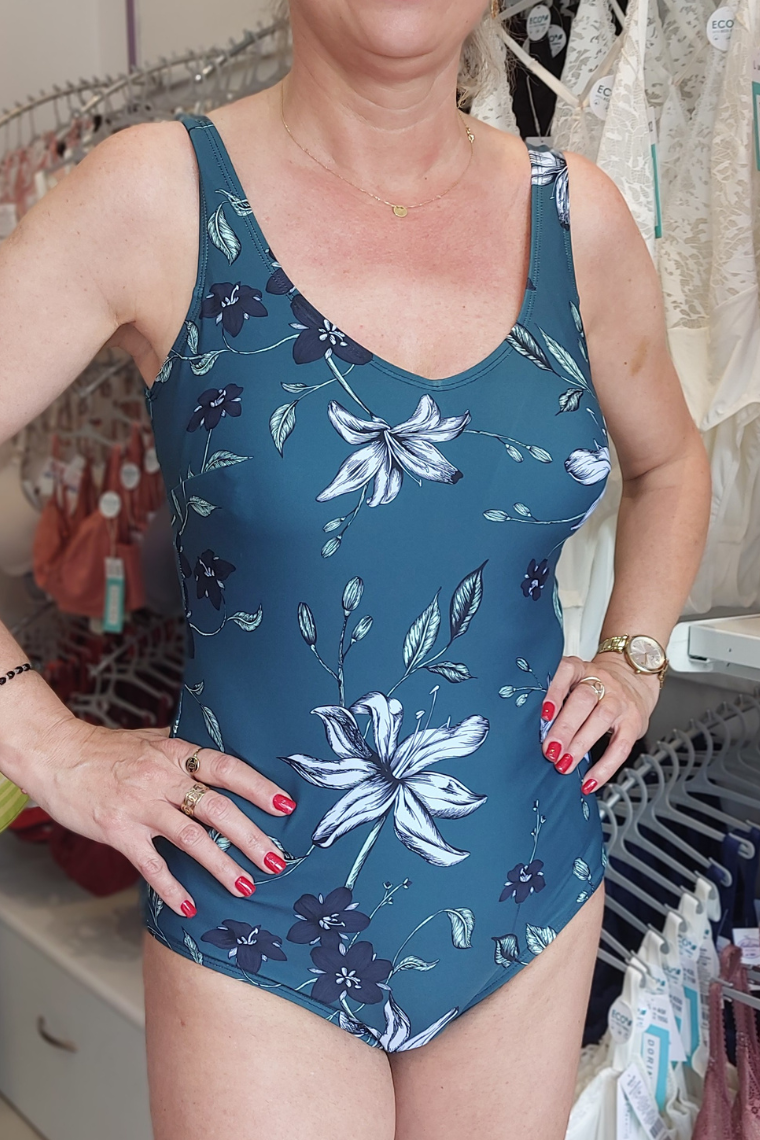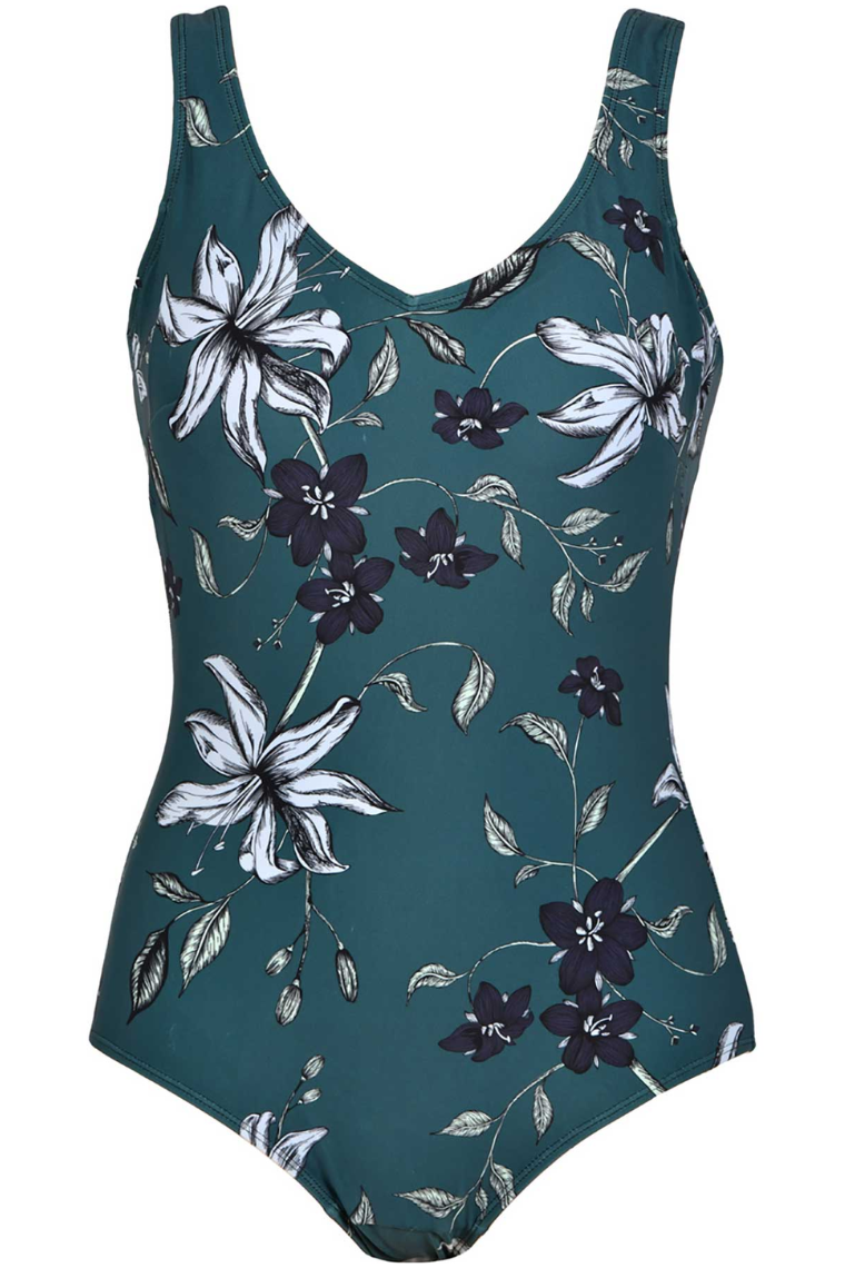 Klasyczny jednoczęściowy strój kąpielowy ozdobiony kolorowymi tropikalnymi kwiatami i liśćmi. Wyrazista kolorystyka kostiumu przyciąga wzrok. Ten strój korygujący podkreśli twoją figurę i poczujesz się w nim wyjątkowo.