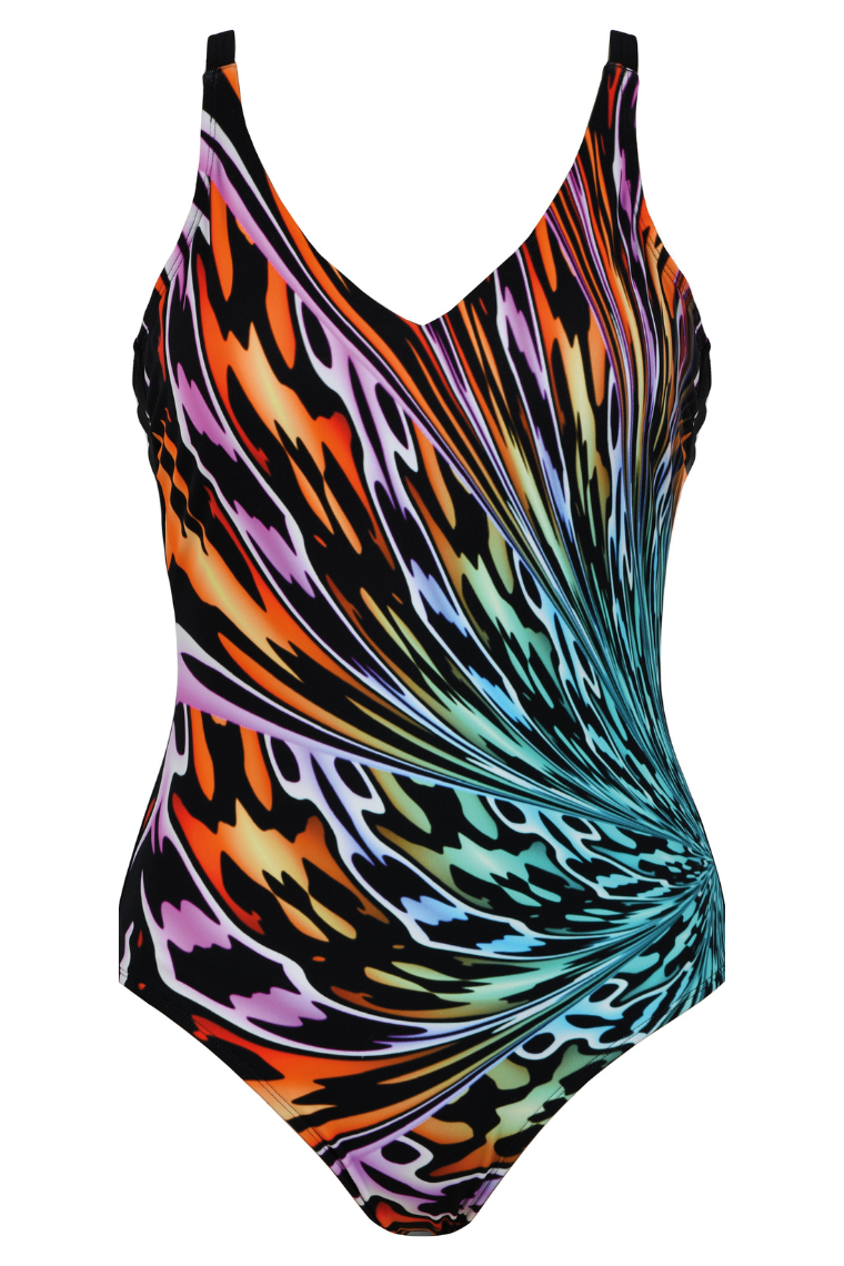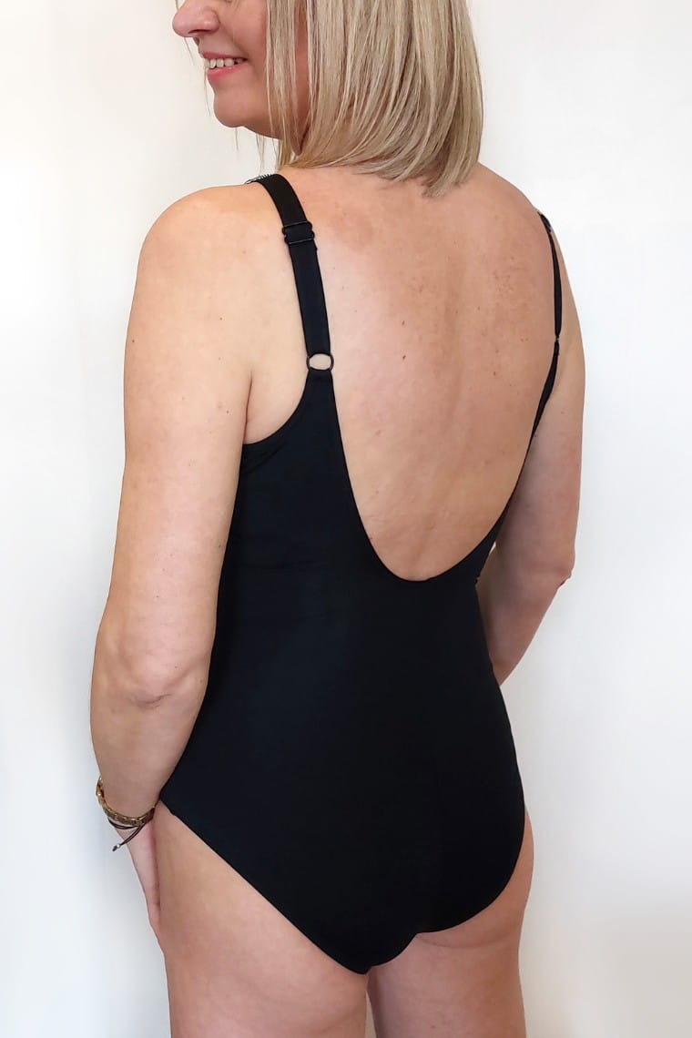 Przód stroju wzmocniony jest gorsetem modelującym (Tummy Control) – podszyciem z mocnej siateczki, które wysmukla i modeluje brzuch oraz talię. Piankowe wkładki na taśmie unoszą i podkreślają biust bez użycia fiszbin. Po bokach na wysokości biustu znajdują się subtelne marszczenia, a wyższe pachy skutecznie zbierają piersi do środka, co daje idealne dopasowanie i komfort.