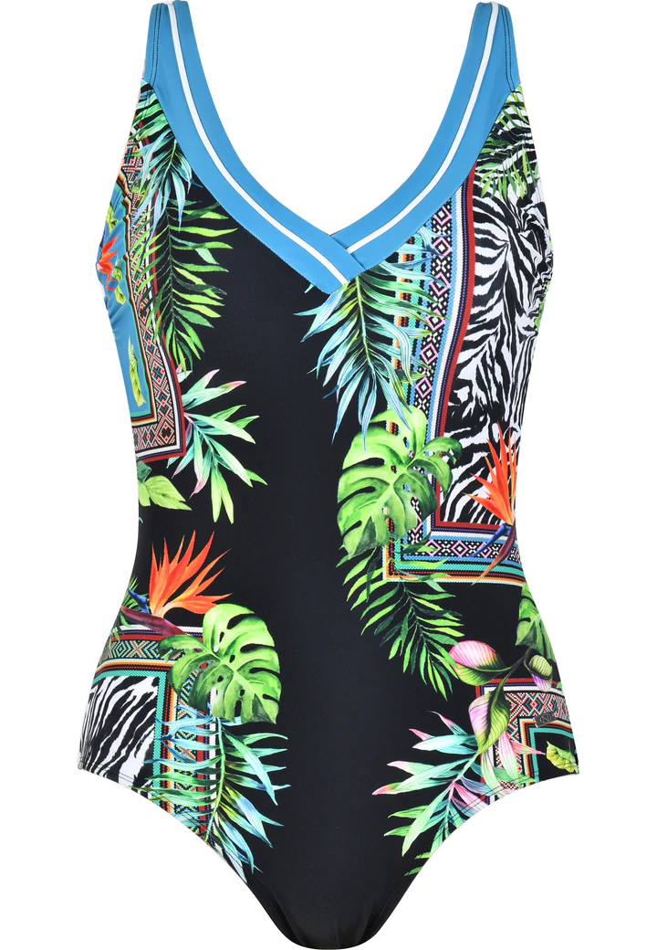 Przód kostiumu wzmocniony gorsetem modelującym. Jest to podszycie z mocnej tkaniny w formie siateczki, która wysmukla i modeluje okolicę brzucha i talii (Tummy Control). Tylna część stroju także wzmocniona dodatkową warstwą tkaniny.