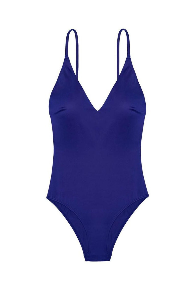 Elegancki jednoczęściowy strój kąpielowy w kolorze chabrowym z linii Eco, wykonany z surowców wtórnych przy zmniejszonym zużyciu wody i energii. Kostium w przepięknym, głębokim odcieniu niebieskiego posiada wyjmowane trójkątne piankowe wkładki oraz zaszewki na wysokości biustu, które podkreślają jego naturalny kształt. Przednia część z dodatkowym podszyciem zapewnia komfort, a tył z głębokimi plecami i ozdobnym wiązaniem pozwala idealnie dopasować kostium do sylwetki.
