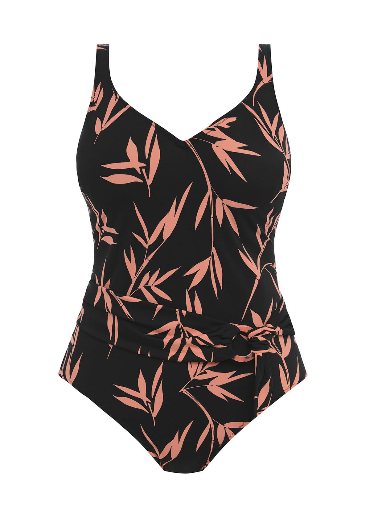 Czarny jednoczęściowy kostium kąpielowy zdobiony motywem bambusa w kolorze brudnego różu.