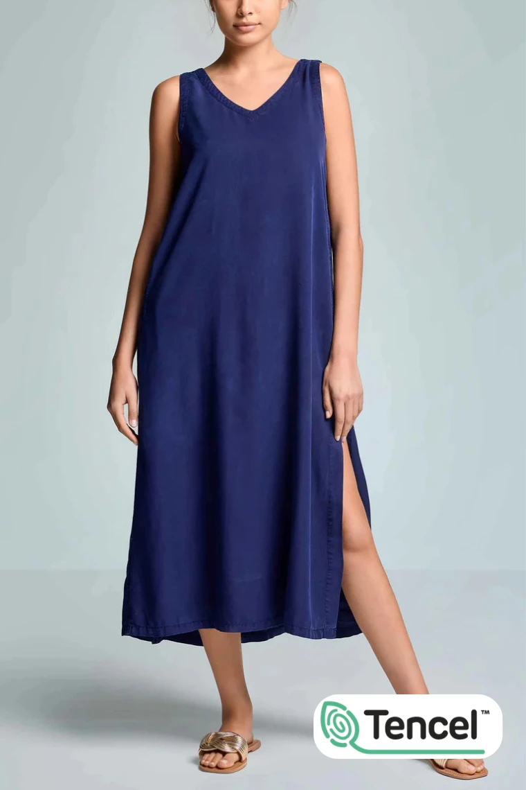 Stylowa, długa sukienka damska wykonana z Tencelu – nowoczesnego włókna o wysokiej przepuszczalności powietrza i doskonałej chłonności. Materiał jest lekki, miękki i jedwabisty w dotyku, a jednocześnie trwały i odporny na częste pranie, co zapewnia komfort noszenia przez długi czas.
