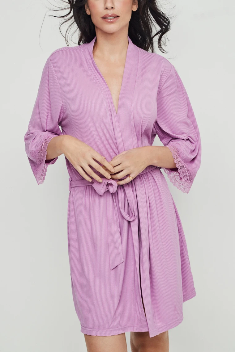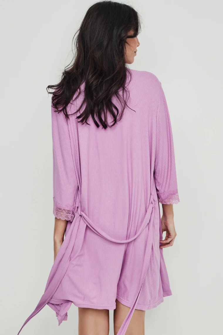 Lekki szlafrok damski wykonany z wysokiej jakości wiskozy o prążkowanej strukturze w delikatnym, lawendowym kolorze. Materiał jest miękki, przewiewny i przyjemny dla skóry, dzięki czemu idealnie sprawdzi się na co dzień oraz w cieplejsze dni.