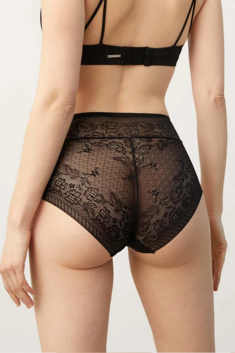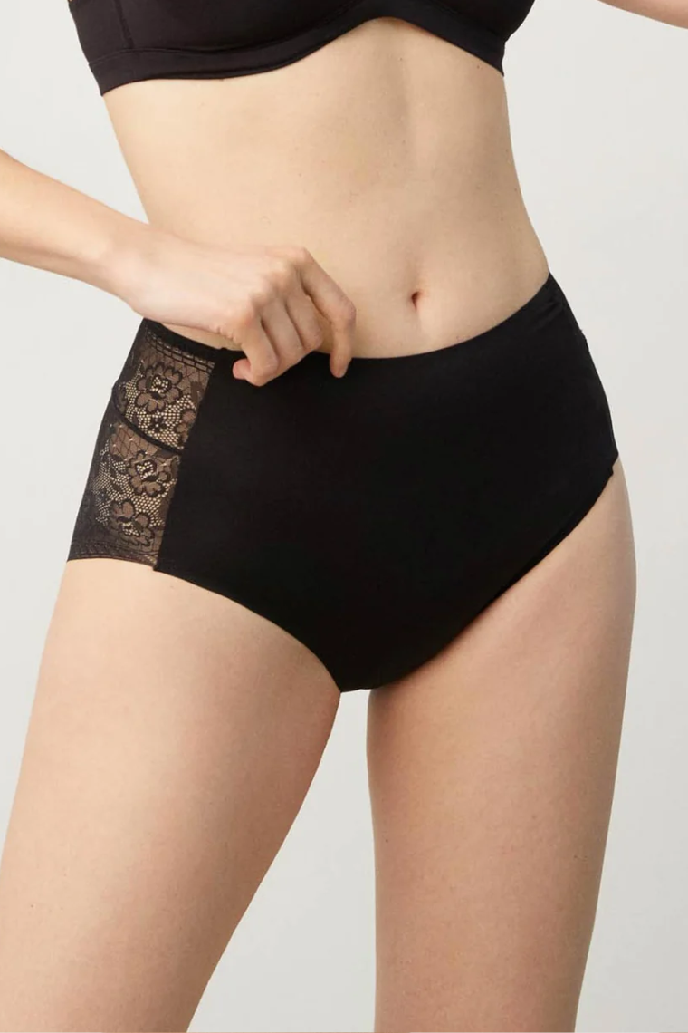 Figi z wysokim stanem i mocniej zabudowanym tyłem. Przód wykonany z gładkiej, jednokolorowej dzianiny (mikrofibra)- lekko modeluje i wygładza okolice brzucha.